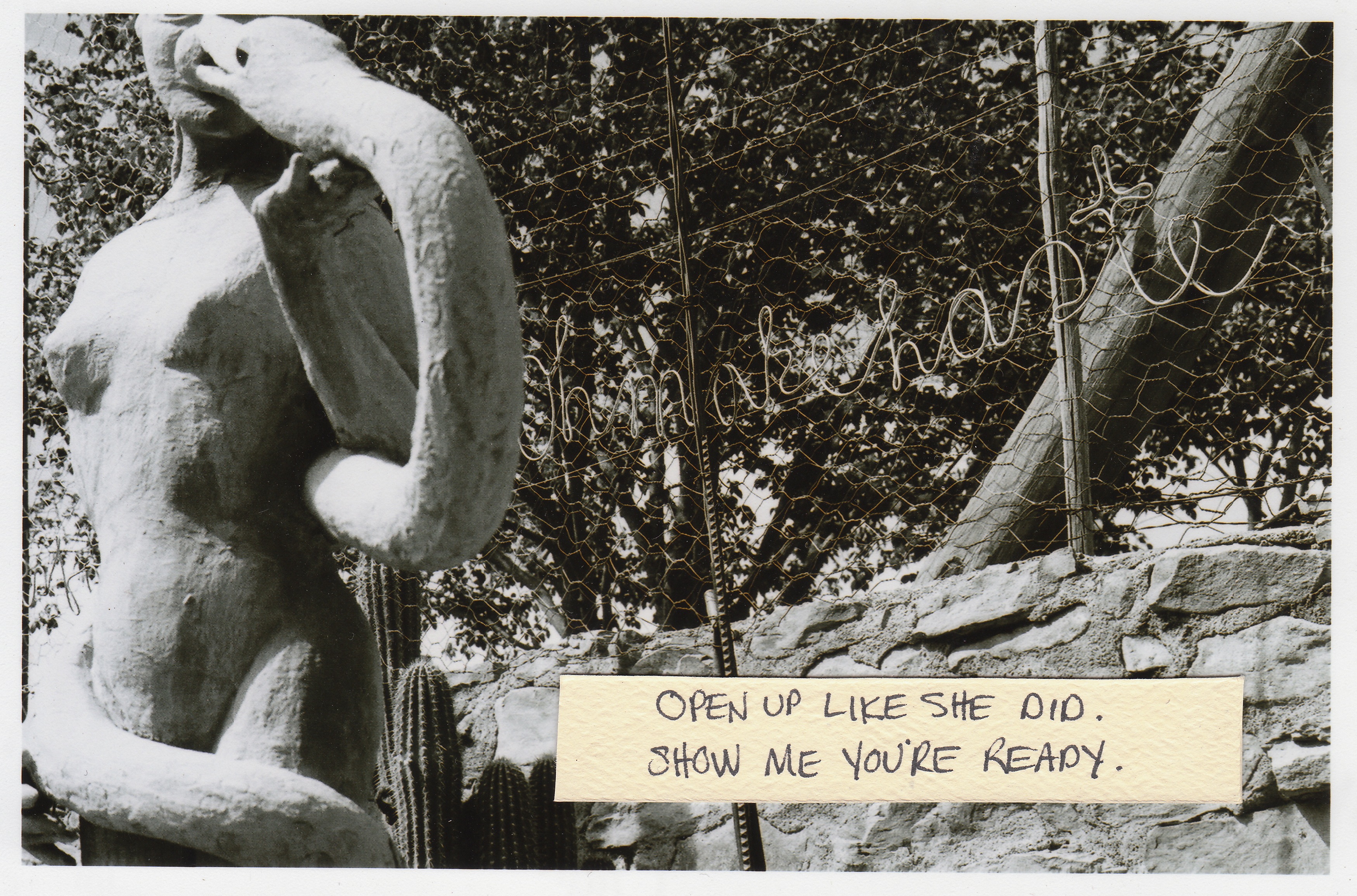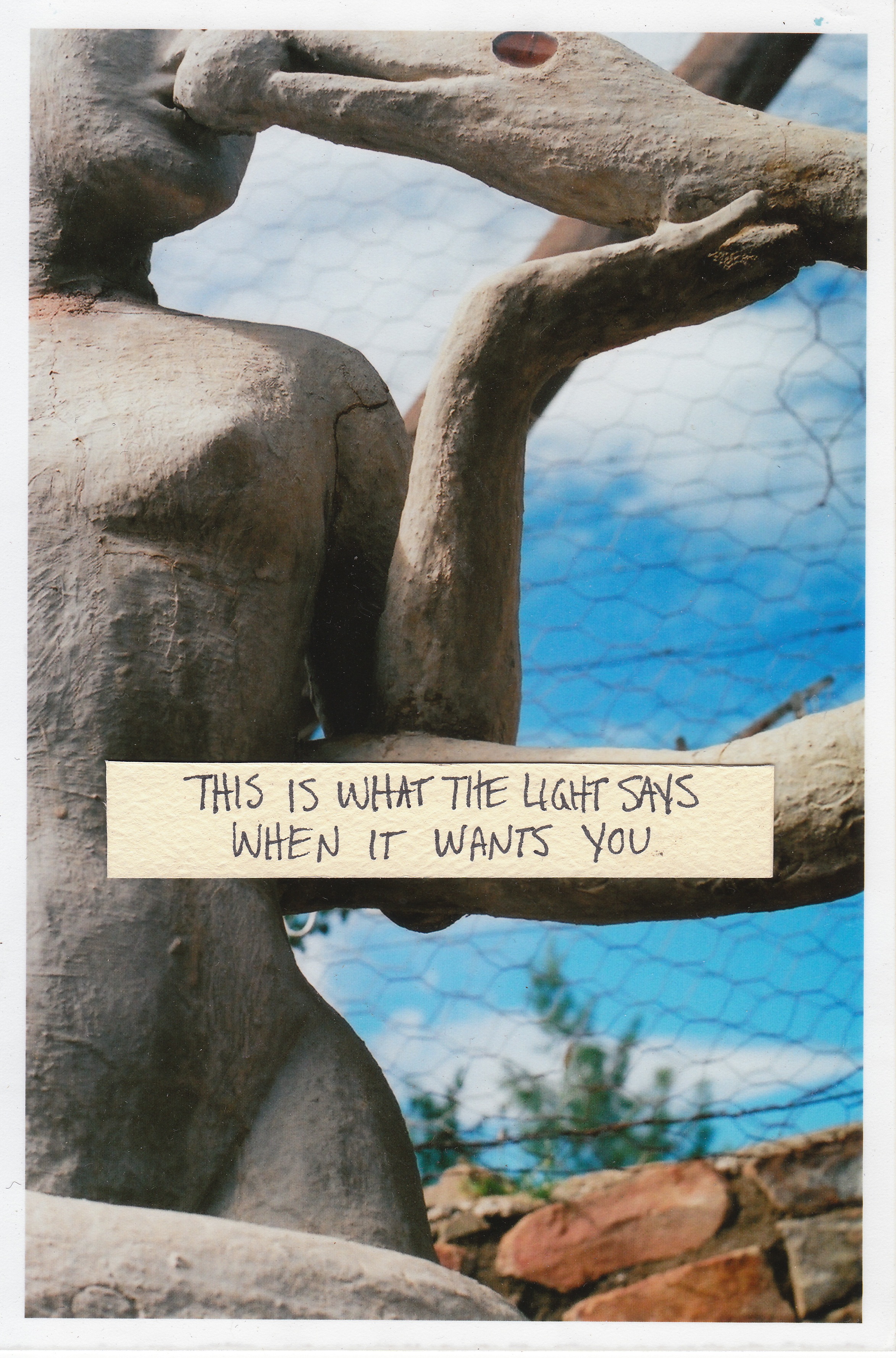 You don’t know the first thing about my light. You can’t know unless you’ve been touched by it, pried open by it, made ash and then whole again by it. You would only know if I’d chosen you, and I haven’t. Not yet. I might. I might never. Someone is always next. There’s always a chosen one, and the light is what makes it happen. It’s a seeking light. It gets thirsty for things to bend around, to wash clean with its wide mouth, with its slow see-through tongue that fills and fills and fills your face. It fills your mouth and your pupils, your house, your town. Up over the mountains and gently, completely in between each one, all the way across the flat bowl of the valley.