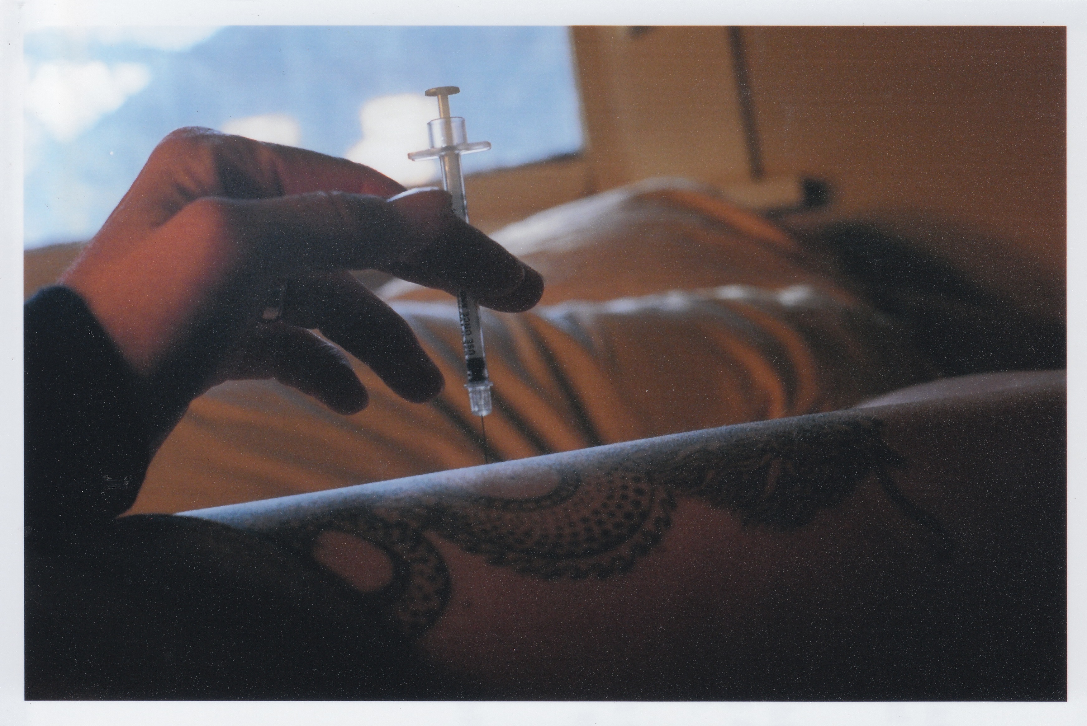 You learn how to inject by using an orange. It helps you get comfortable making contact and depressing the plunger, but you don’t get a good feel for how it’s going to pop through the fibers of your skin. You get that later. The one thing you know right away is that it’s going to be tough to dress this up.