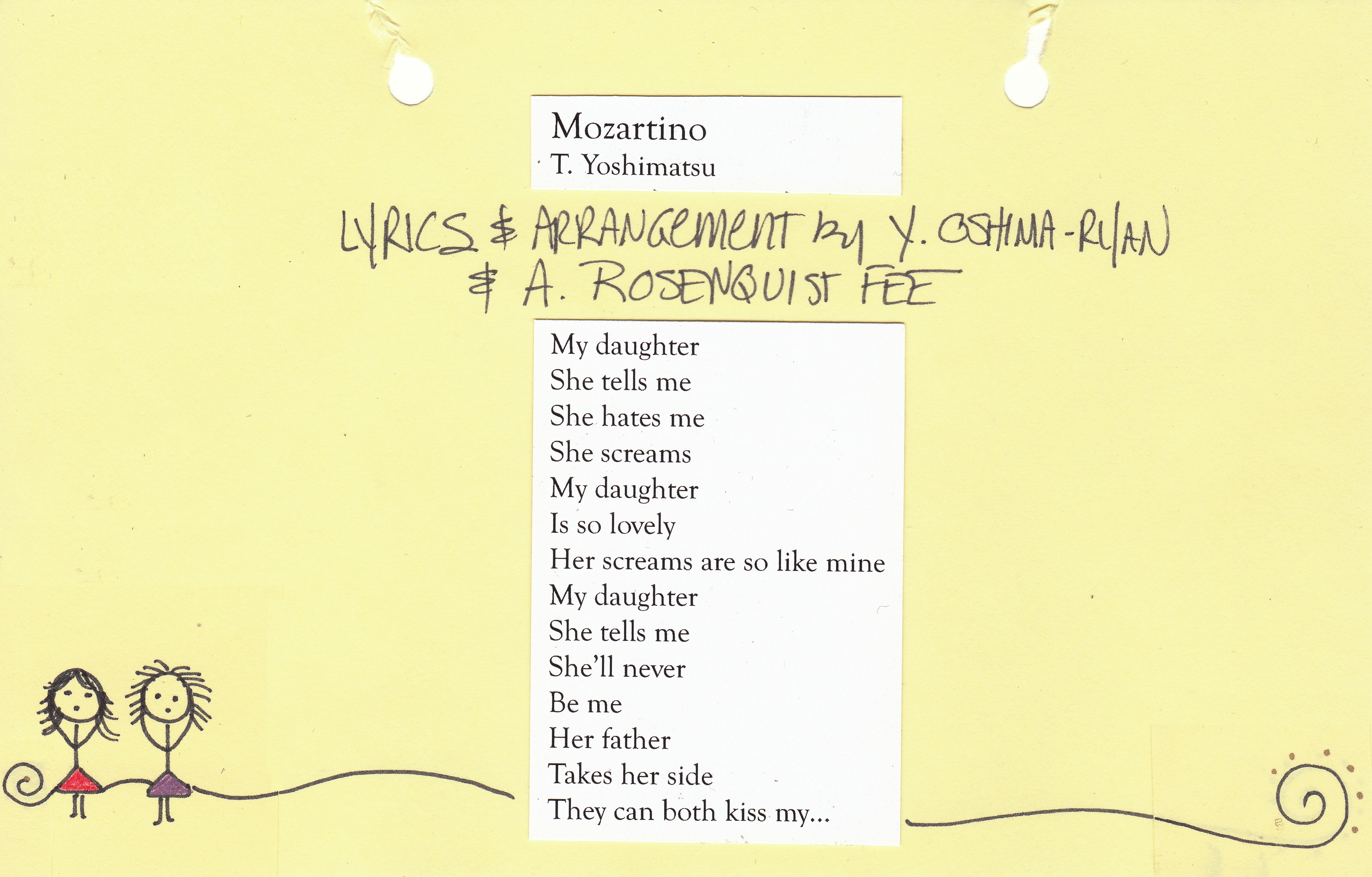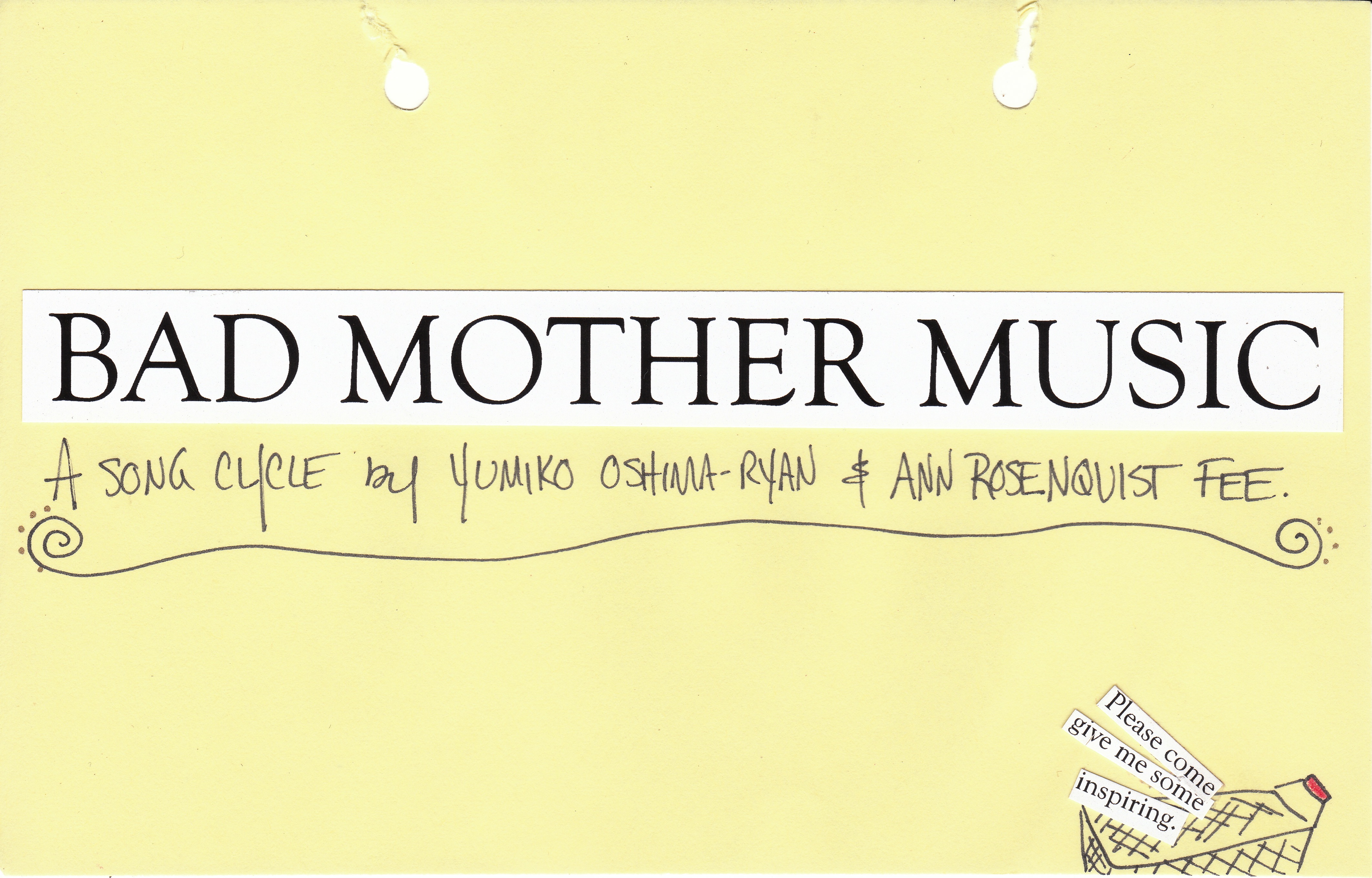 Bad Mother Music. A song cycle by Yumiko Oshima-Ryan & Ann Rosenquist Fee. Sneak preview Saturday, Feb. 18, 2012, 7:00 p.m. in Music Area Room 103 in the Schaefer Fine Arts Center at Gustavus Adolphus College. Bad mothers wishing to be on the guest list should get in touch: annrosenquistfee {at} hotmail.com. You know who you are.