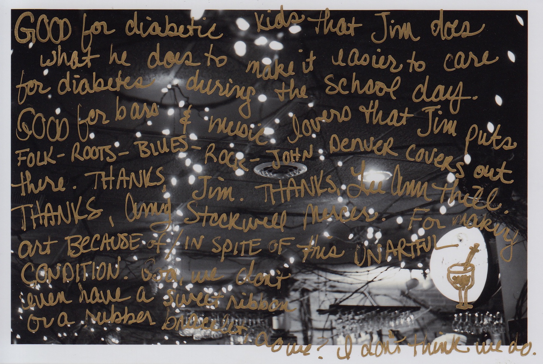 It’s good for kids with diabetes that Jim does what he does to make it easier to get care during the school day. It’s good for bars and for music lovers that Jim puts folk-roots-blues-rock-John Denver covers out there with so much sell and hope and integrity. Thanks, Jim, for the work on both fronts. Thanks also, LeeAnn Thill, for making up Diabetes Art Day and prompting us all to think artfully about such an unartful condition. Thanks too, Amy Stockwell Mercer, for being a longtime bridge between the art world and the diabetes world with passionate writings on both. You guys are the best. You guys make clear that the only way to deal with a weird mix is to wear it really, really well.