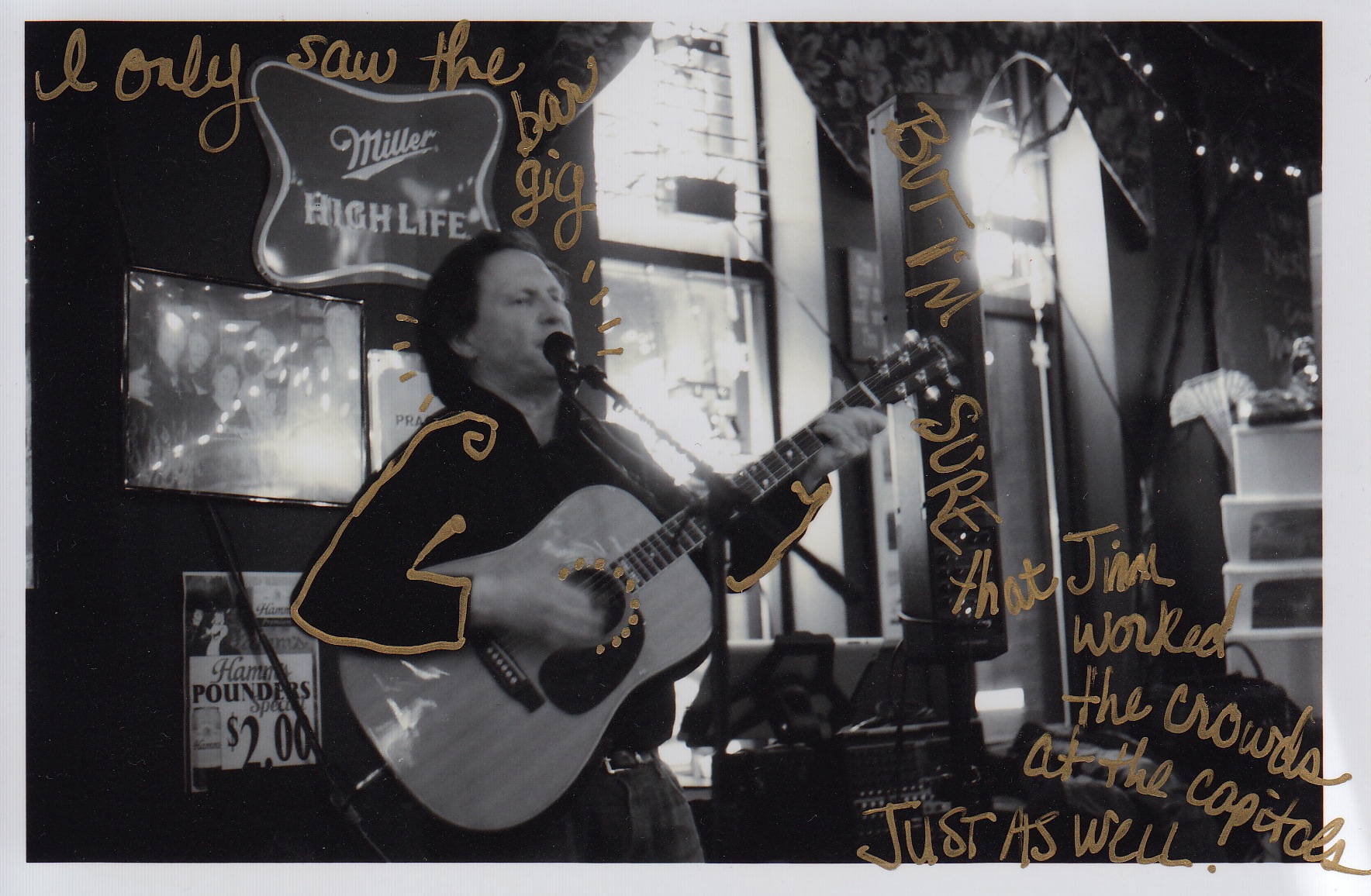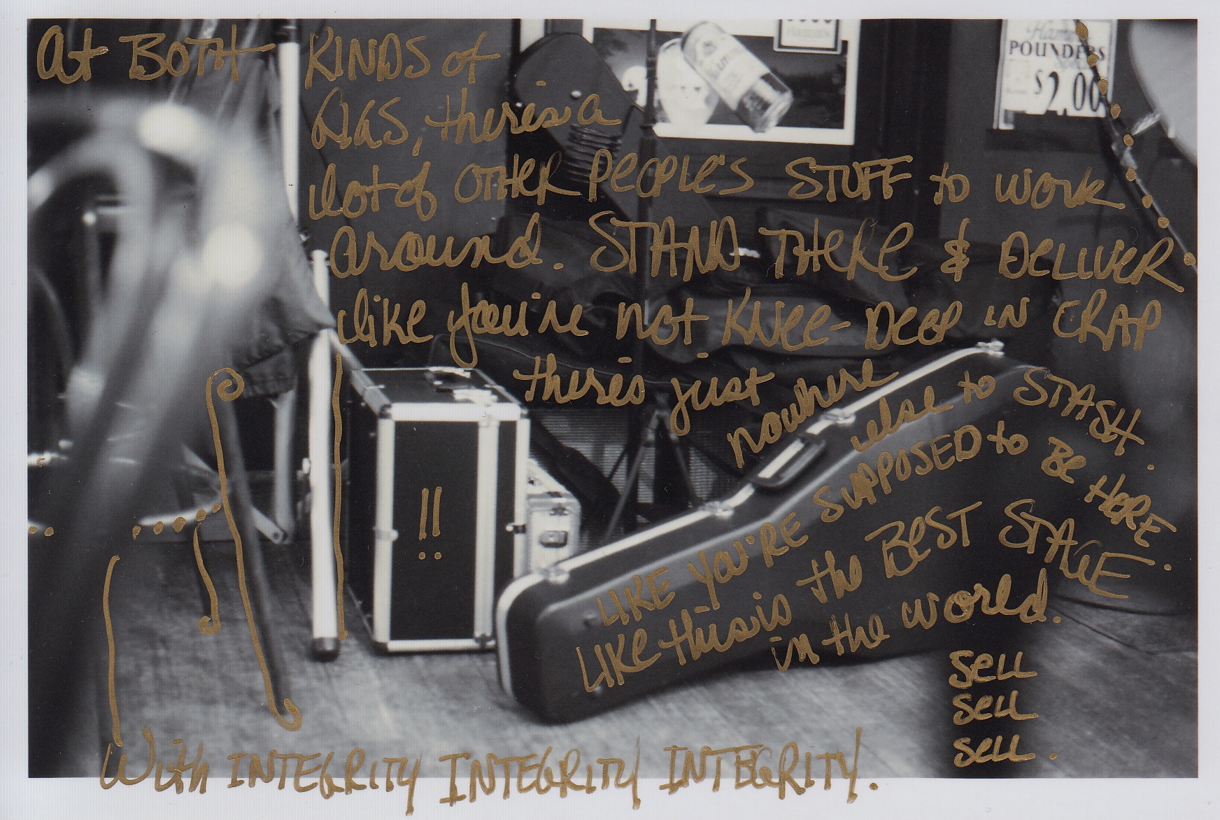 At both kinds of gigs, there’s stuff to work around. Other people’s stuff. You have to stand there and deliver like you’re not knee-deep in crap there’s just nowhere else to stash. You really have to act like you’re the main thing happening here, right now, or nobody’s going to buy it. I am guessing Jim would say this is where being a bar band and being an advocacy director come together.