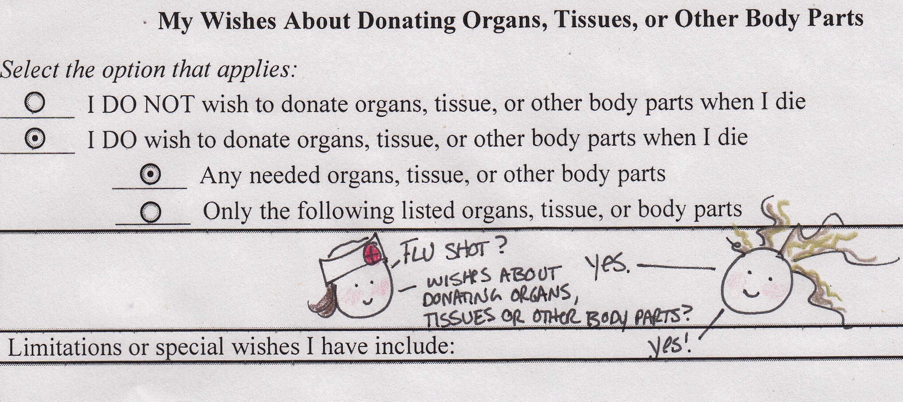 Very cute! and just so you know, my health directive is in order! DNR and Yes to organ donation, although I don’t know how much call there is for organs 69 years used! Love you, mom