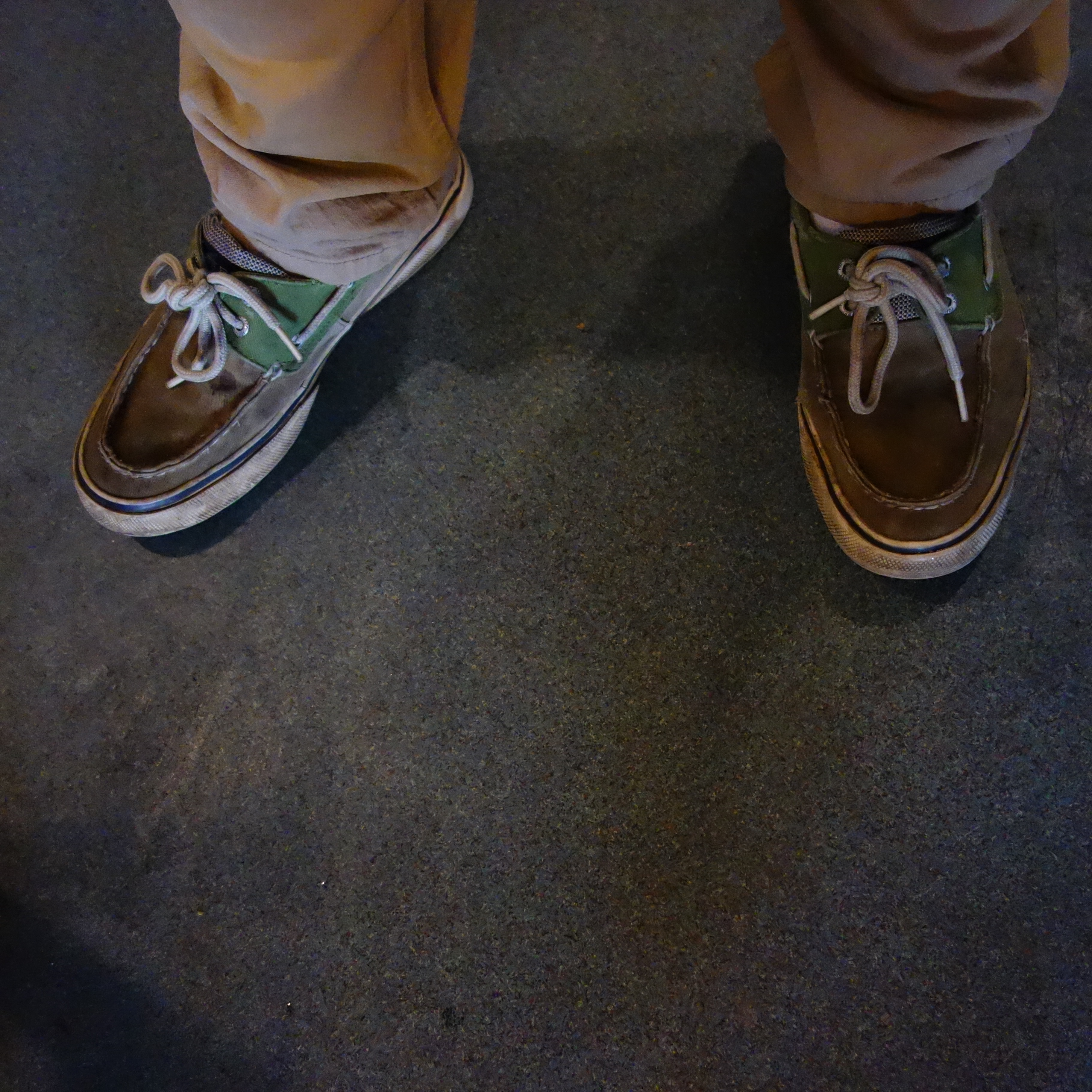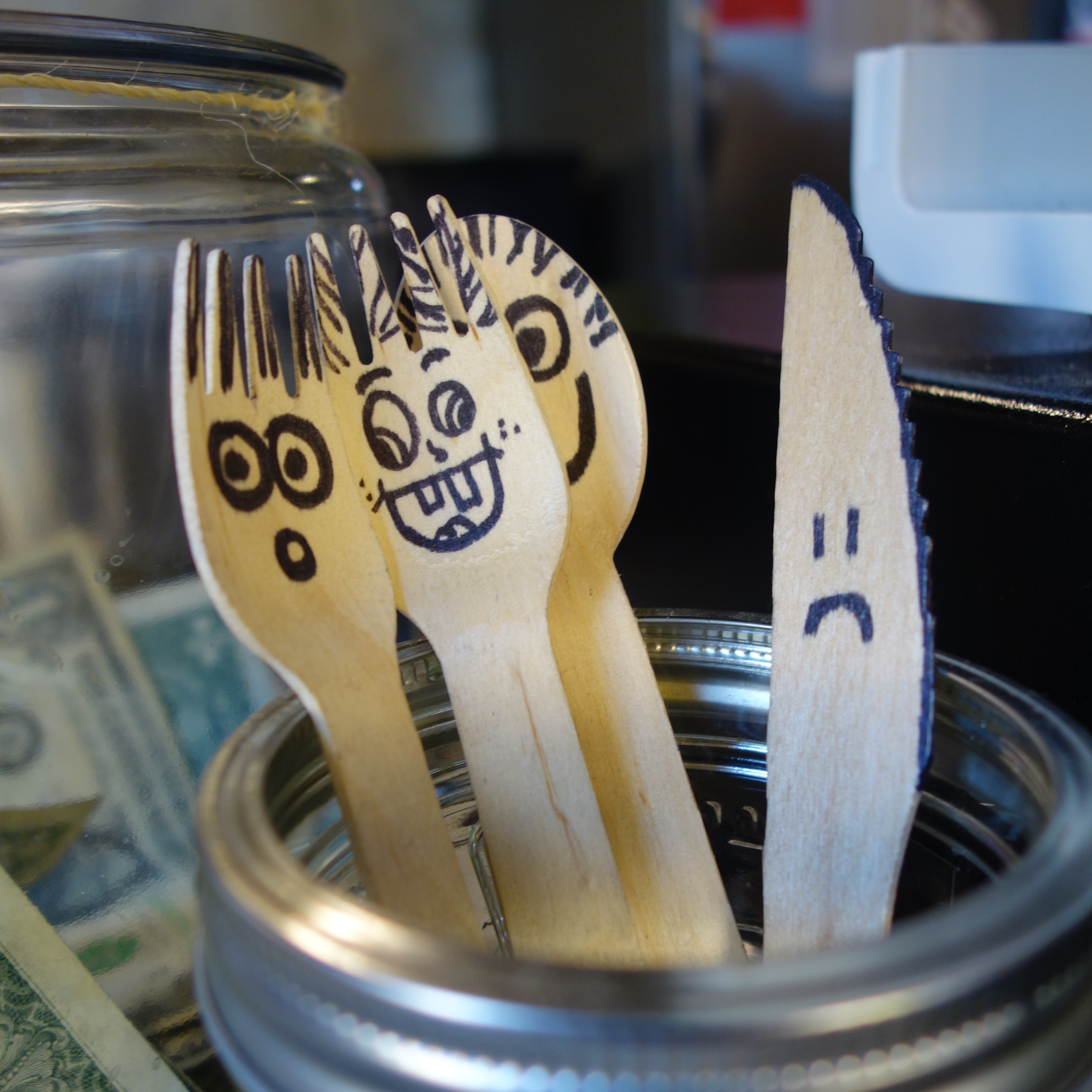 Also, I enjoy his art. The knife. The knife is Grant’s. Much like the small slice of whimsy on the shoes, you gotta work for this. It requires a little bit of thought to delight in the sad-face knife.