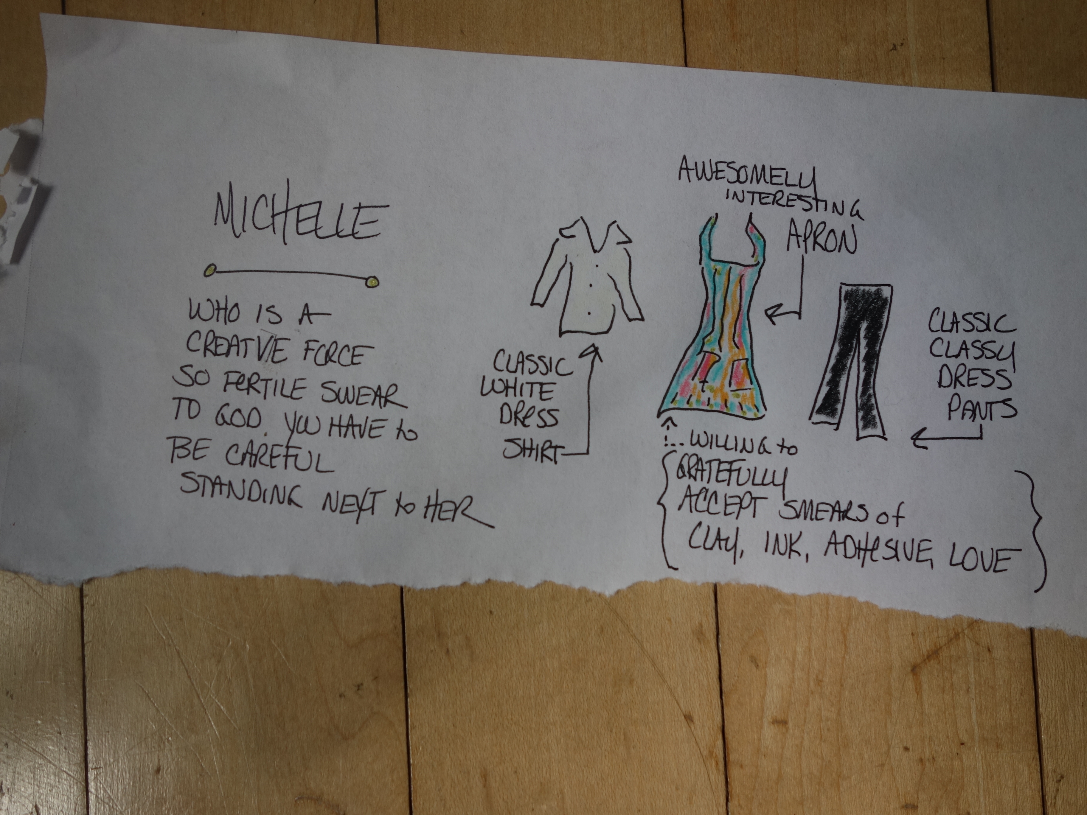 This I love. It’s uniform-upon-uniform, functional-upon-classy/dressy, the dirtiest of things upon the one thing we all know should not cannot get dirty: The white blouse. THE white blouse. What Michelle has here is a juxtaposition of different kinds of elegance, both of which play with boy vs. girl, clean vs. dirty, white collar vs. clay collar (that’s my new fashion term for professional potters — you are welcome, potters!). It’s just all-around really good.