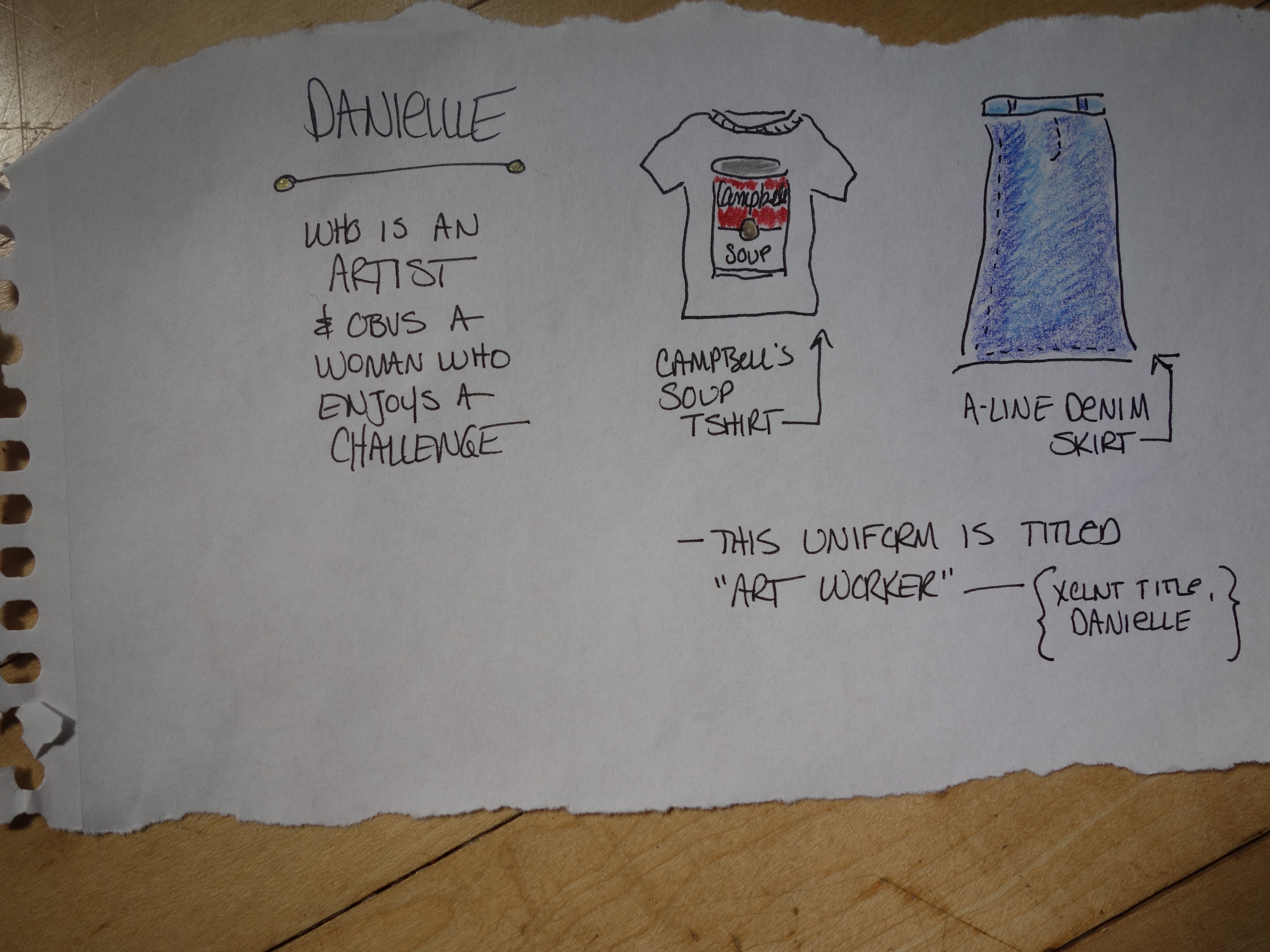 I don’t know Danielle very well but she strikes me as a creative who could go for miles and miles in many different directions. She’s done a hardcore job here of limiting her choices, so that probably gets her way more than nine new minutes per week. But then add laundry time, because we are talking about a single t-shirt and I don’t know if she has multiples, but then again laundry time is also good thinking time. God, Danielle, I don’t know if this means you have an extra hour per week, or just the nine minutes, or what. I do know that your purist interpretation of “uniform” entitles you to the most varied possible use of any new time it provides. So my suggestion is that you balance the admirably severe limitation of A-line-denim-skirt plus Campbell’s-Soup-t-shirt with as much free-falling creative chaos as you can handle.