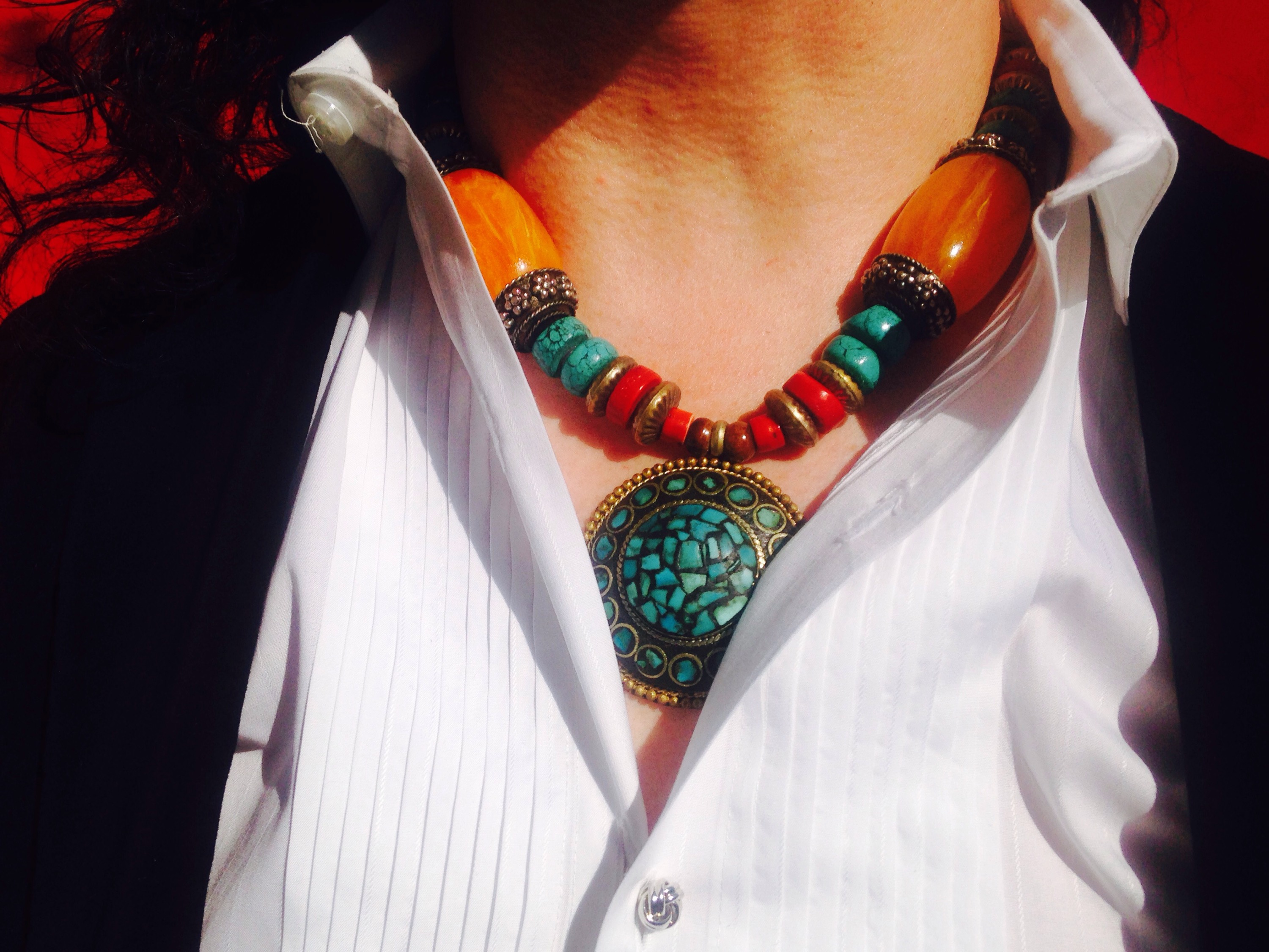 “Today, I am wearing a black velvet sport coat…a large Asian inspired necklace from Cambodia in turquoise, coral, and amber…