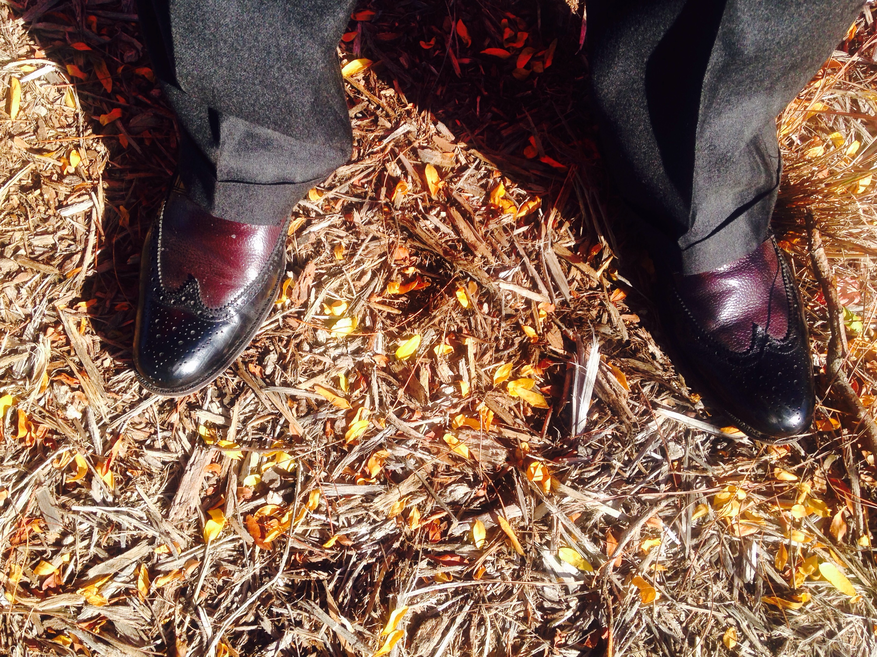 …charcoal grey vintage trousers with cuff, two-tone wingtips in black and maroon by Joseph Abboud…