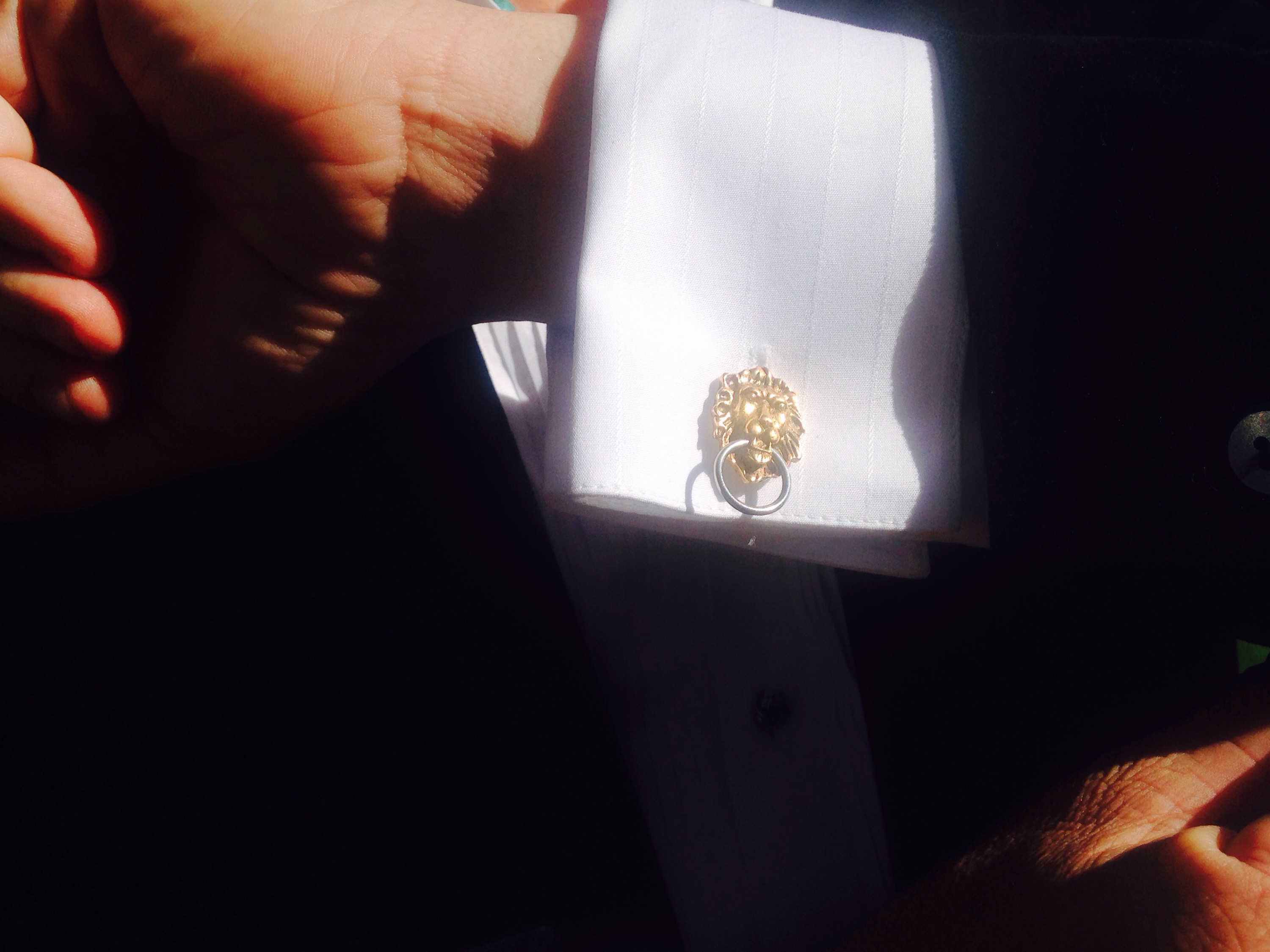 …lion head cufflinks that look like miniature door knockers with a metal ring through their mouth…