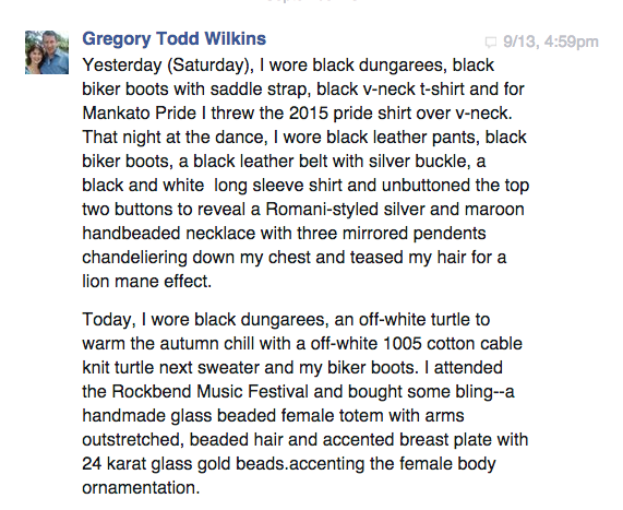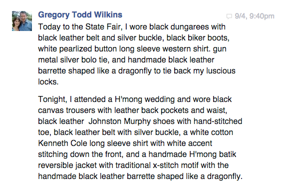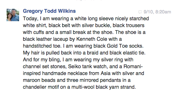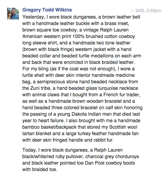 Here’s what Greg wore on the next-to-last day. He wore this to work. I don’t know Greg’s work agenda that day but I would guess it didn’t call for this. And yet, look. Look what he curated for his publics to see.