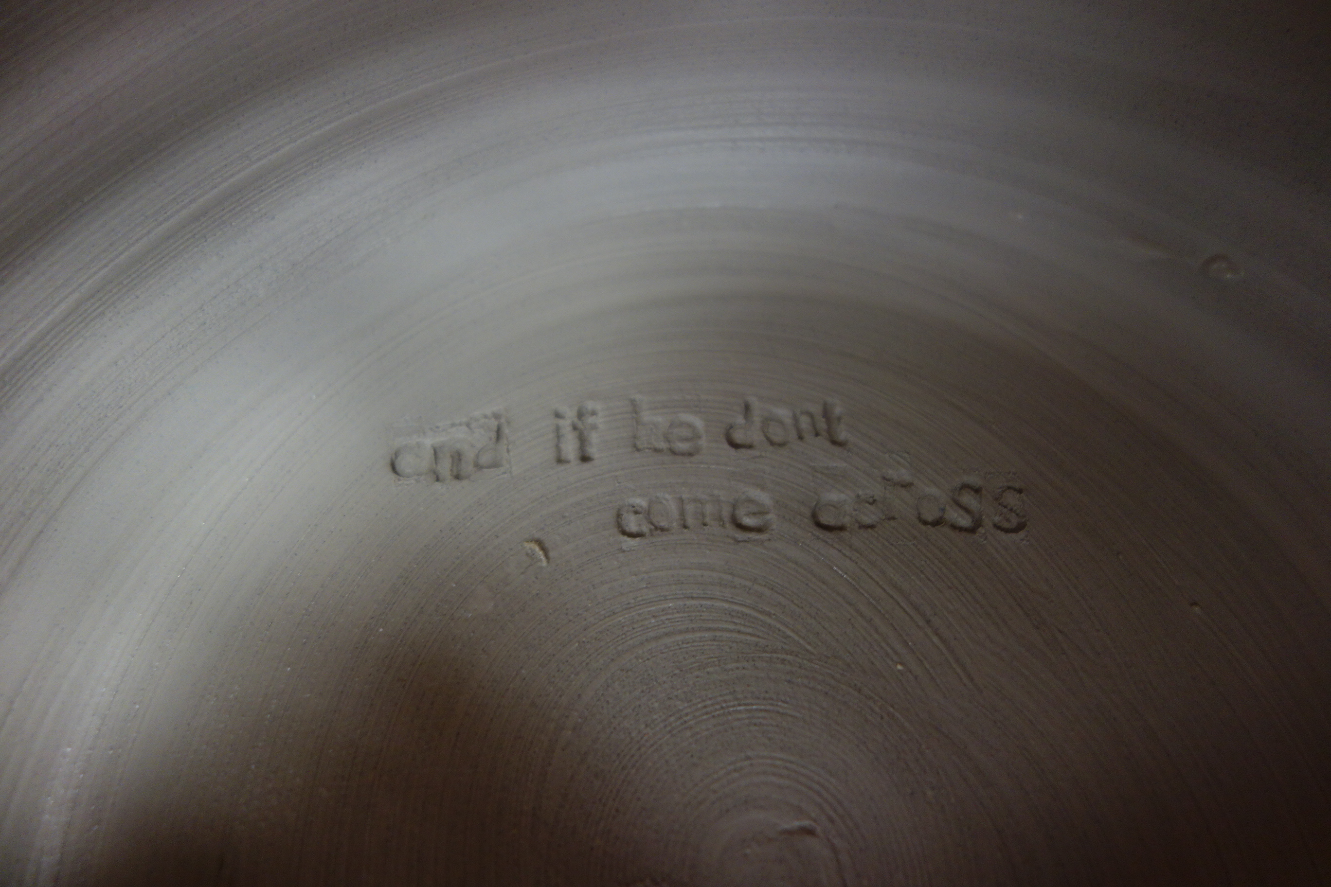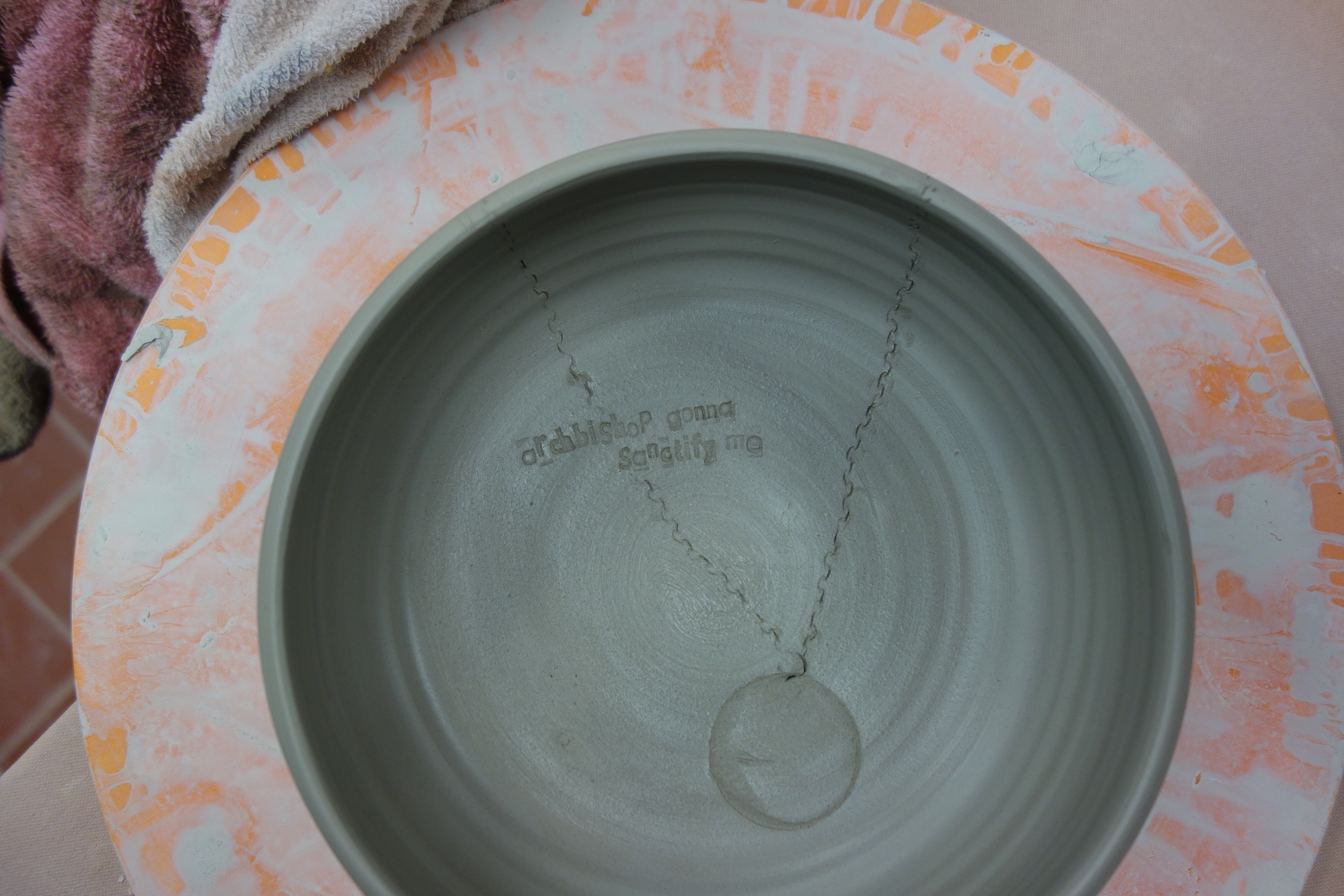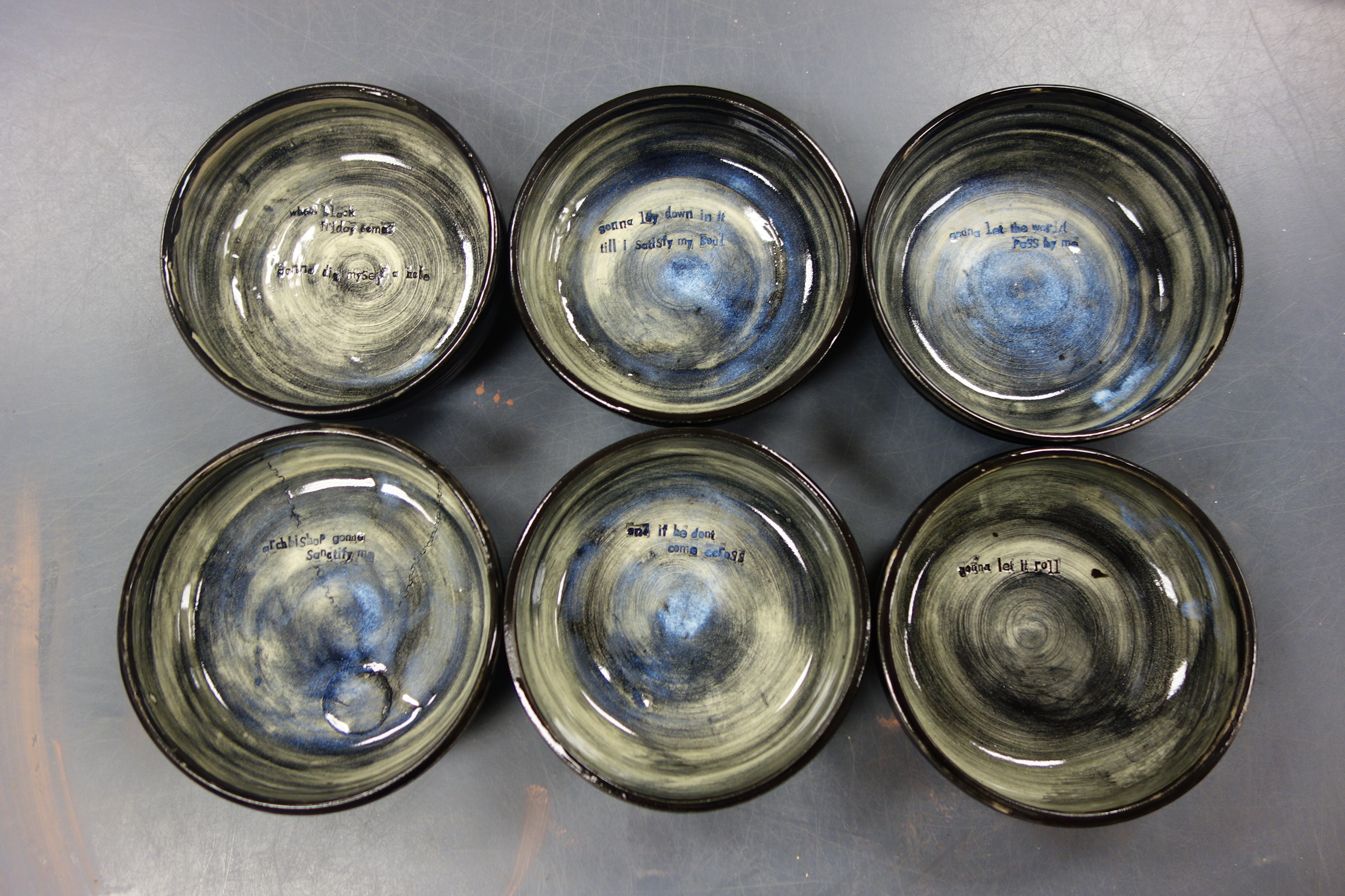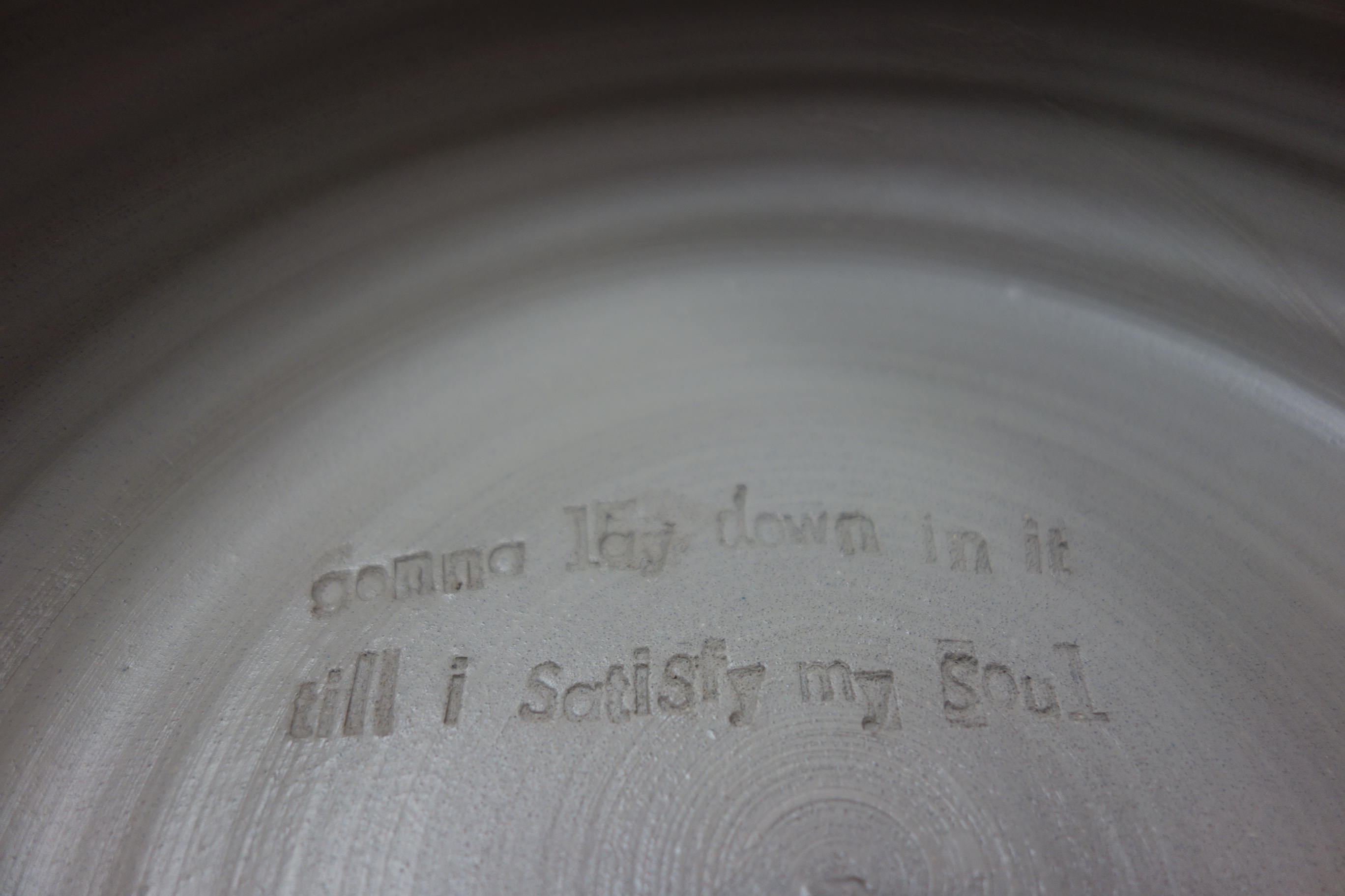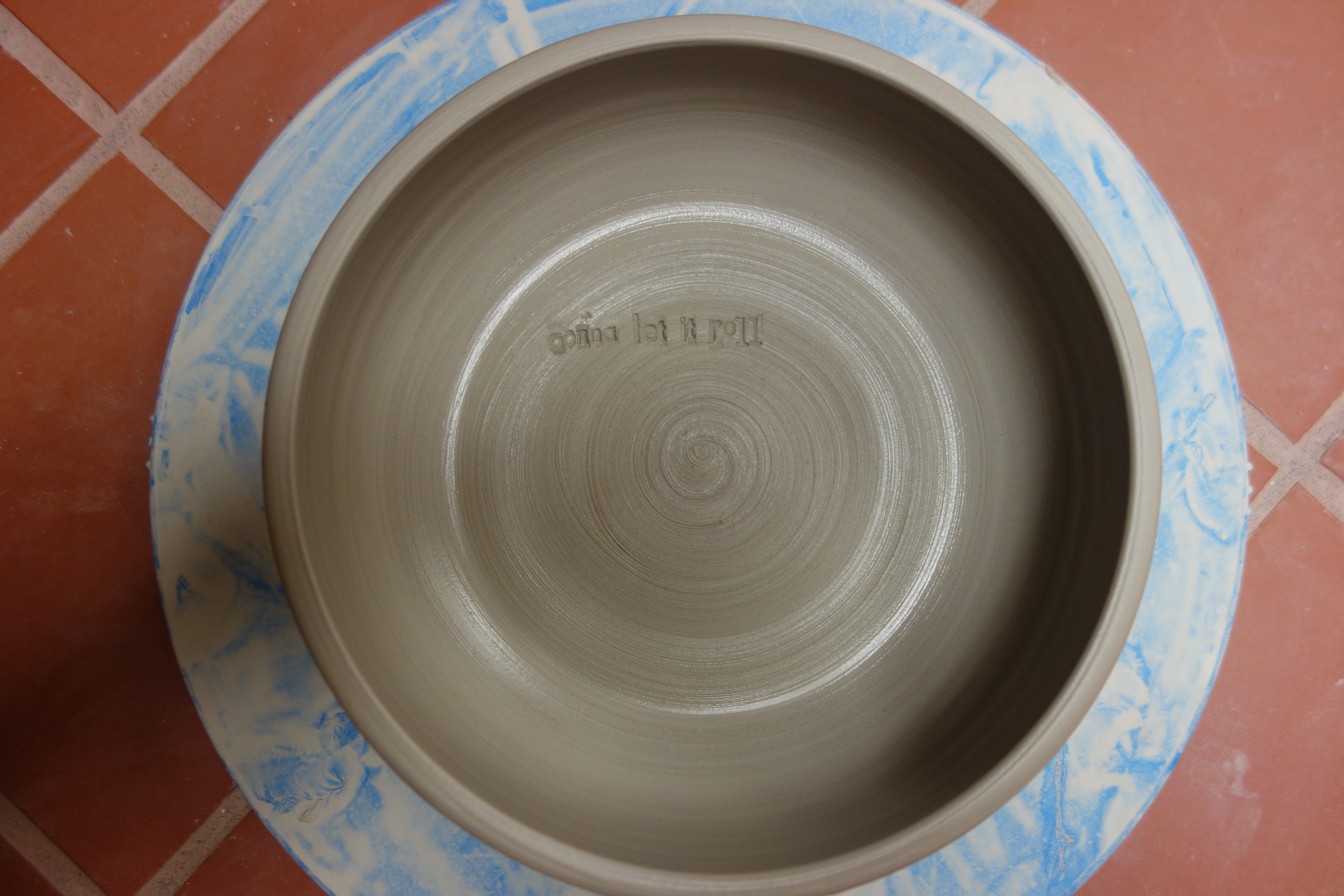 Caitlin tells me to wait until they’re leather-hard and then do the lyrics. I don’t know what “leather-hard” means, though, and turns out it’s a not what I thought, so the first line is sloppy. See the fingerprints on “gonna?” Turns out it doesn’t work to smudge away the first attempt and start over. But, you know, what’s done is done, and I’ve watched the people who hang around here turn screw-ups into fine fine things, so I find myself a paintbrush and go at it.