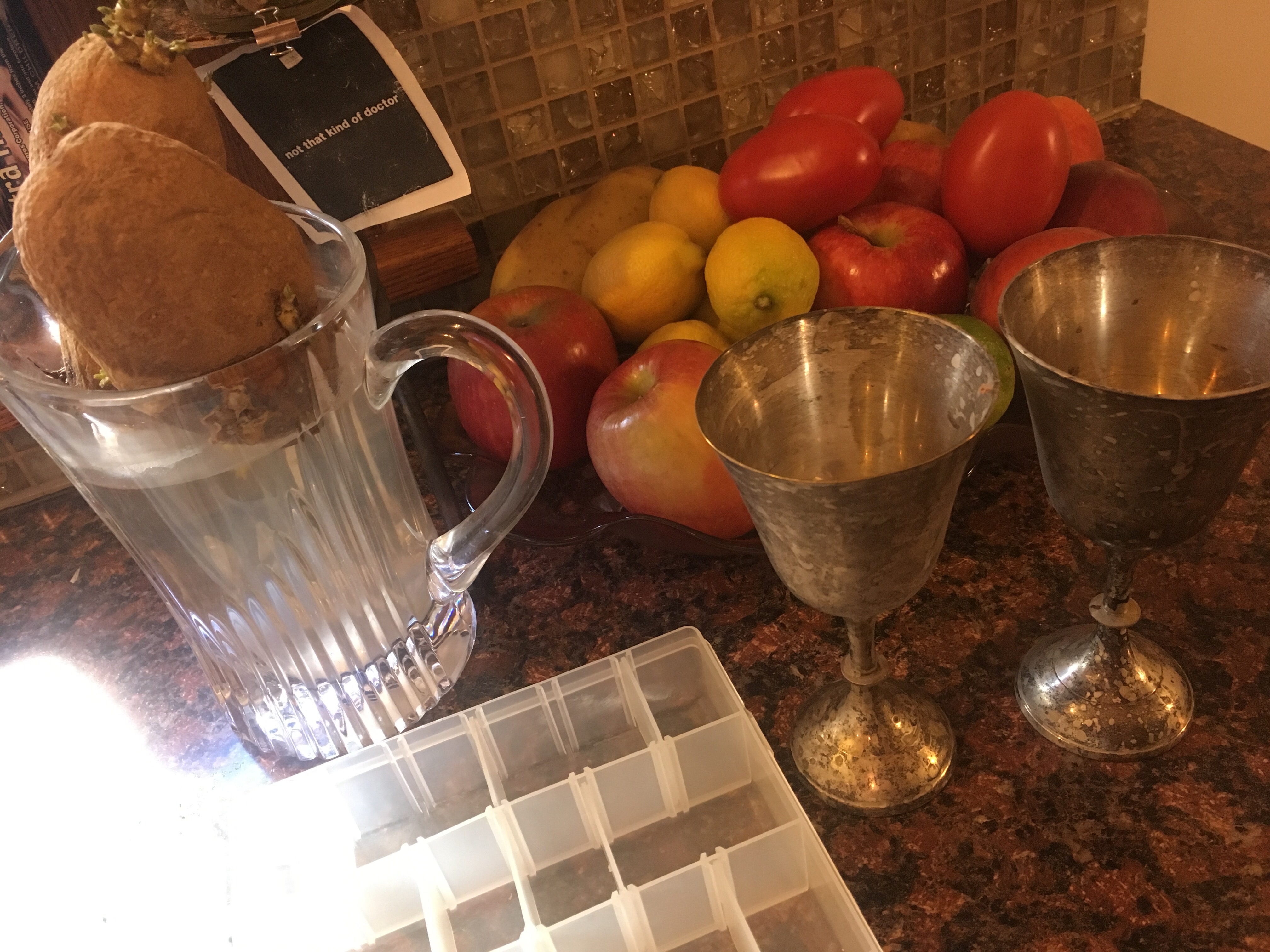 Goblets from my Uncle Tom. Don’t remember who gave the pink glass platter. Crystal pitcher from my boss at the time, and you guys, it came with instructions for washing ONLY IN WATER AND RICE. Swish with rice. Come on. I feel very good about this as a potato-sprouting vessel, 26 years on. Tackle box courtesy of Scott just now because I mentioned that I need to upgrade my medication storage system.