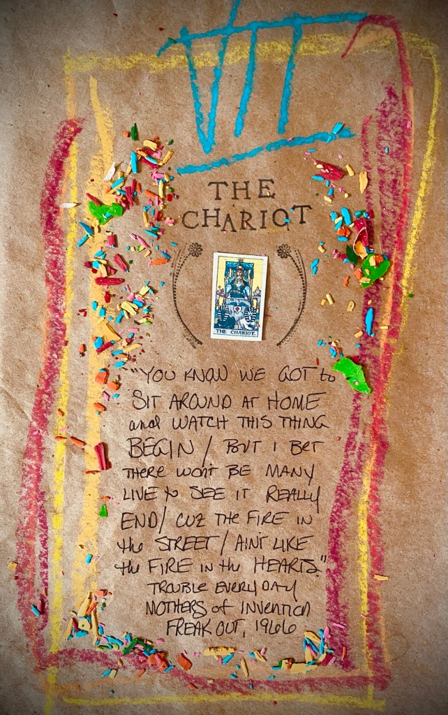 The Chariot is that moment when you find yourself in the driver’s seat of a thing you previously thought was happening TO you. I couldn’t find a Steely Dan lyric that suited this card because in the universe of The Dan, everything is happening TO the protagonist. And what’s happening is mostly rejection and loss. Thank goodness for the Mothers of Invention weighing in at mild-sense-of-agency with these lines from “Trouble Every Day” (Freak Out, 1966).