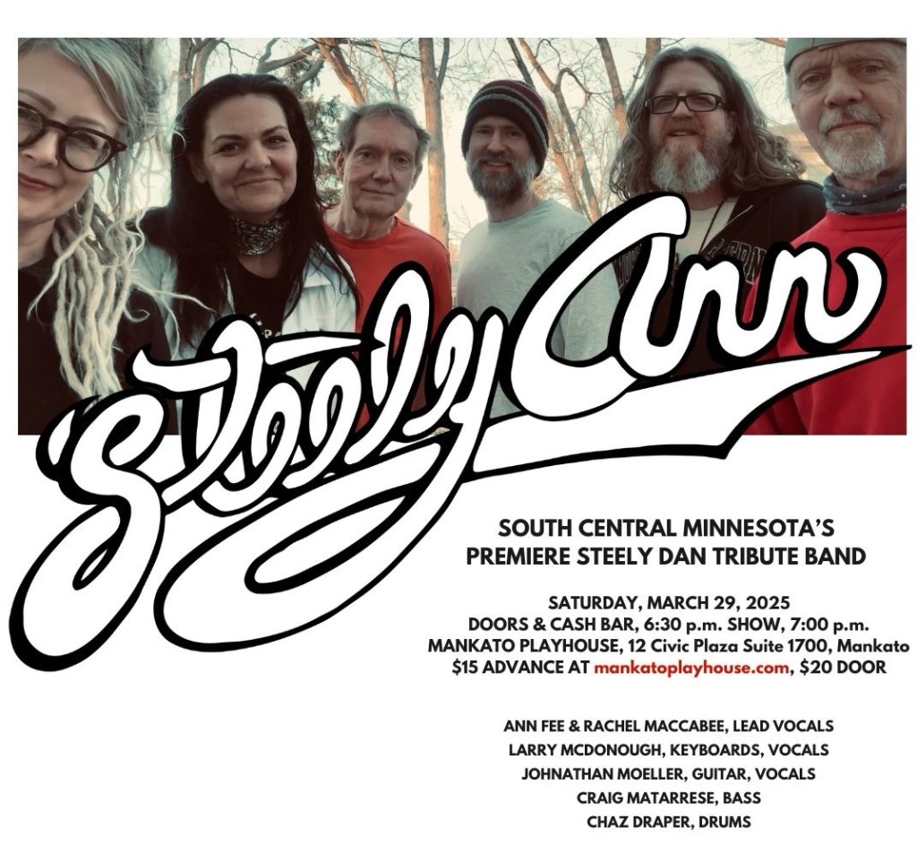 So outrageous. STEELY ANN is South Central Minnesota’s premiere Steely Dan tribute band, a title they’ll make every effort to defend the last weekend in March when Twin Cities-based STEELING DAN takes the stage at Chanhassen Dinner Theater, a mere 55 miles away, within 24 hours of STEELY ANN’s one-night-only show March 29 at Mankato Playhouse, 6:30 p.m. doors and cash bar, 7:00 p.m. show, $15 advance at mankatoplayhouse.com, $20 at the door. Read about STEELY ANN here. Buy tickets here. Listen to 28 glorious seconds of rehearsal below.