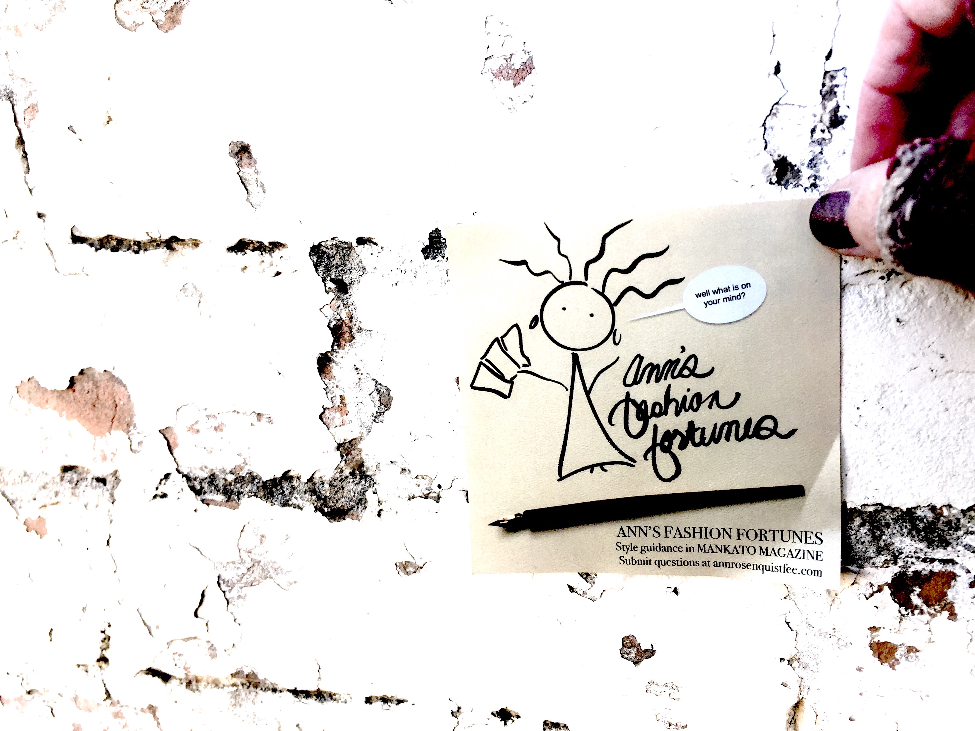 Ann’s Fashion Fortunes: Submit a question! Ann’s Fashion Fortune stickers dress up any crumbling disappointment! Want a sticker?! Submit a question! ANN’S FASHION FORTUNES is a style advice column appearing monthly in Mankato Magazine. Questions may be edited for publication. Submit a question Go backYour message has been sent Name or pseudonym(required) Warning Email(required) Warning Question(required) Warning Warning. Submit Δ Share this: Click to share on X (Opens in new window) X Click to share on Facebook (Opens in new window) Facebook Like Loading...